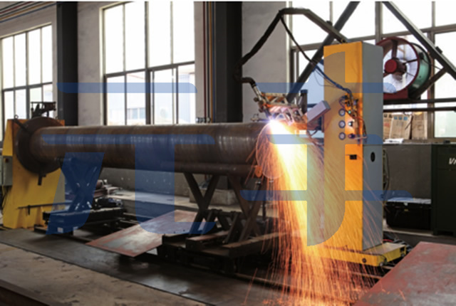 管道數(shù)控相貫線切割機是一種對鋼管端部結(jié)合處作自動計算和切斷的設備。該設備能精確進行管道結(jié)構(gòu)件的切割加工。在實際直埋保溫管道系統(tǒng)中有大量的管道結(jié)合相貫線孔、相貫線端頭,還有俗稱“蝦米節(jié)”的彎頭,以前此類加工大多采用制作樣板、劃線、人工放樣、手工切割、人工打磨等落后又繁復的方法來進行,而我公司引進的管道數(shù)控相貫線切割機具有定角度坡口面切割功能,變角度坡口面切割功能,切割速度變化自動控制功能等,能十分方便地切割此類工件,并且操作工人不須編程,只需輸入相互配合的管子的半徑、相交角度等參數(shù),機器就能自動切割出管子的相貫線、相貫孔、以及焊接坡口,不再需要人工打磨,保證保溫管道的生產(chǎn)效率和質(zhì)量。